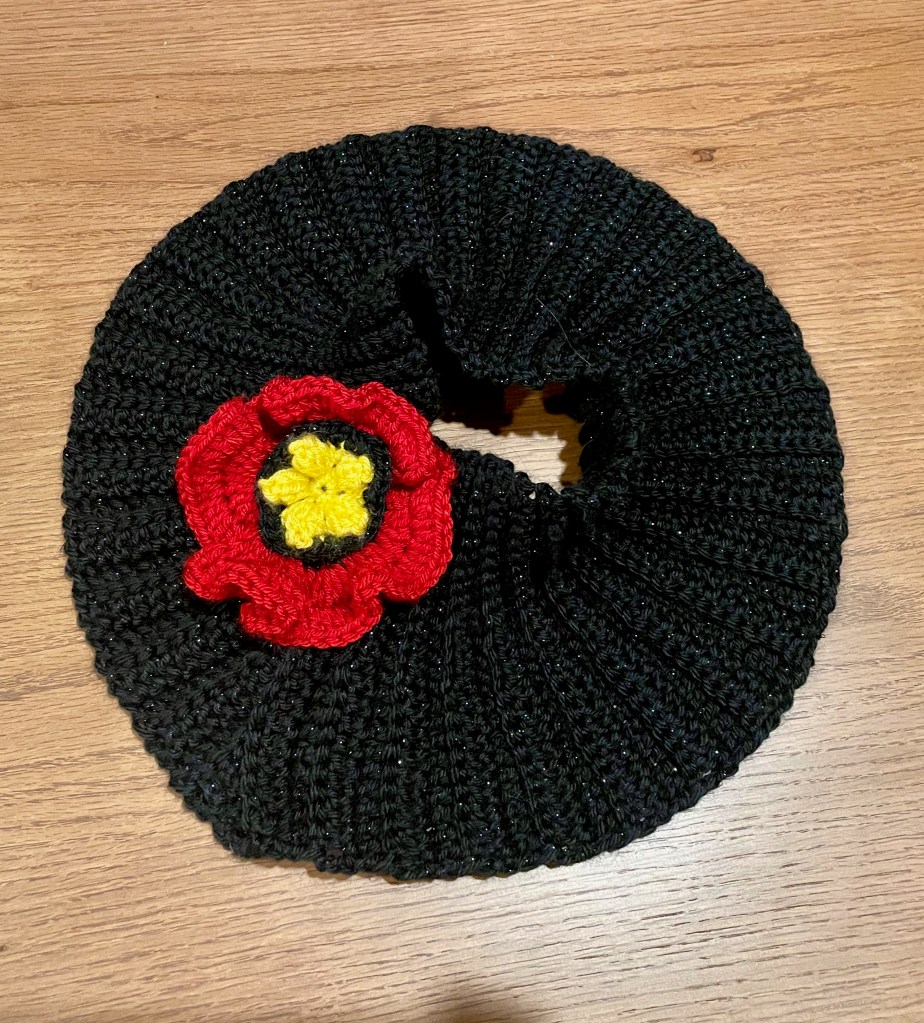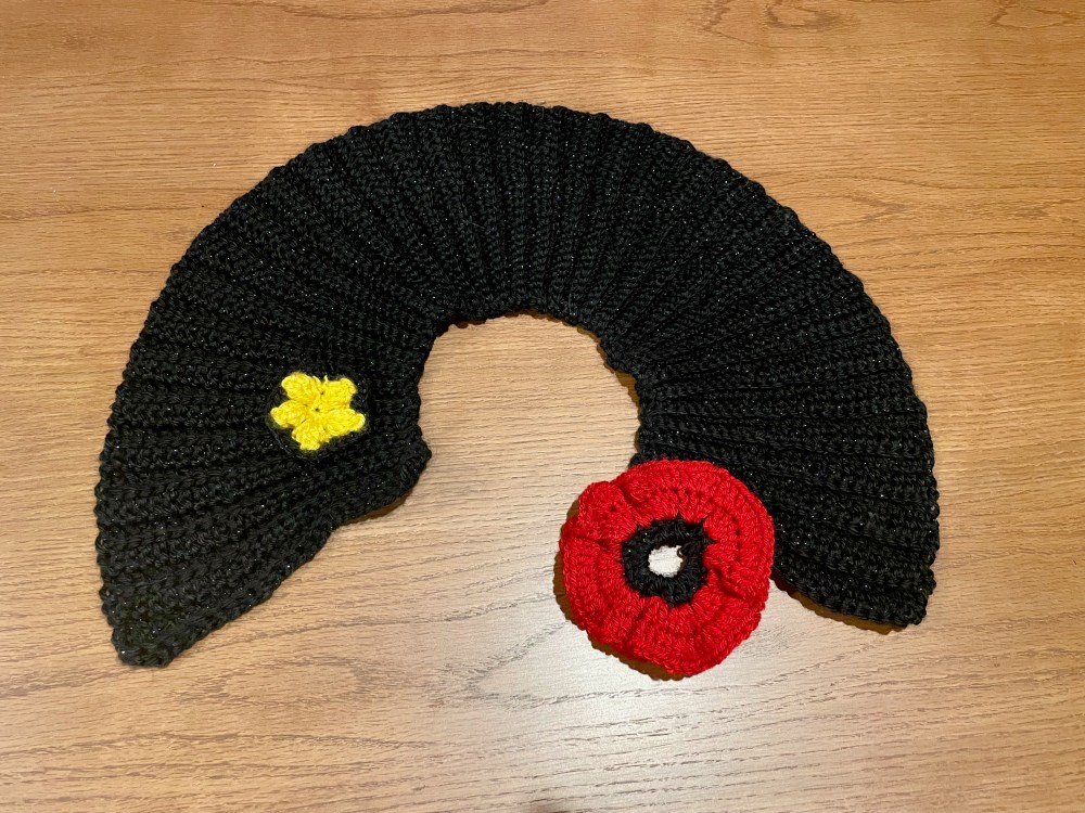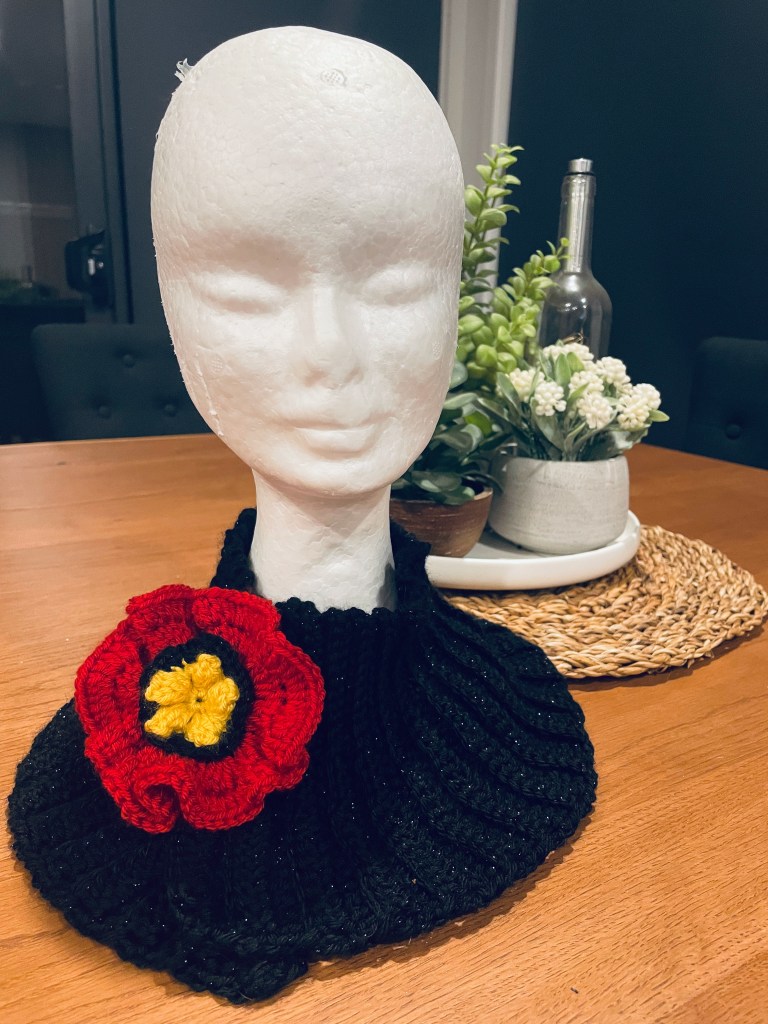 This cowl is my way of wearing the poppy during the often chilly dawn service. It is relatively quick and easy to make with the start of the poppy and the positioning of the button the only bits that need a bit of patience. The ‘stamen’ of the poppy forms a ‘button’ that holds the cowl closed.
