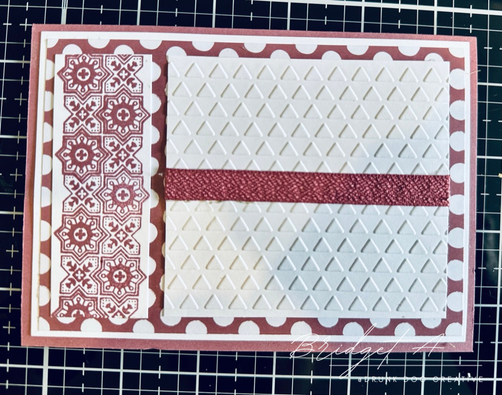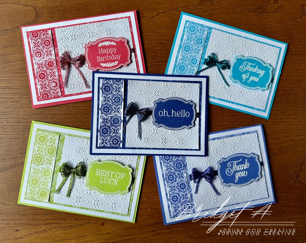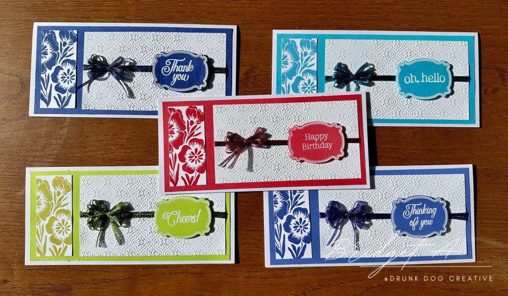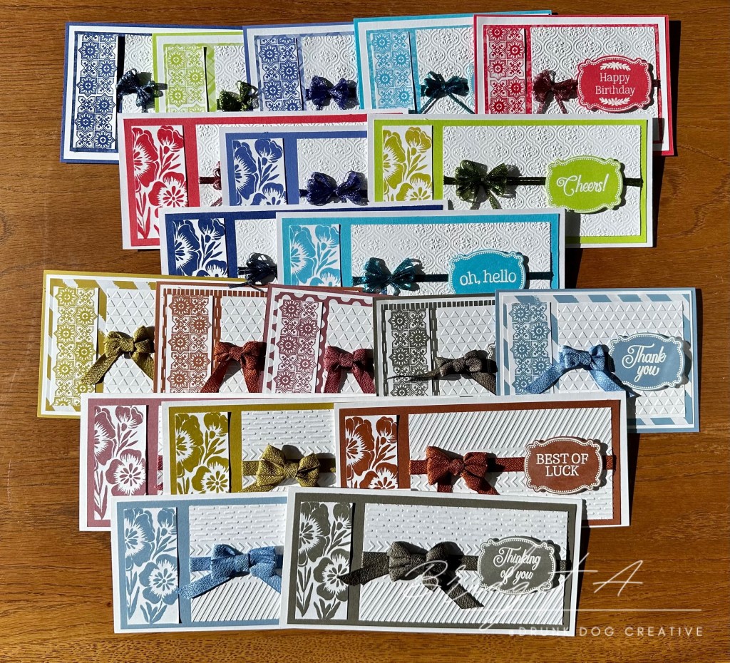 The 2022-2024 In Color Ribbon is very thin so I used three strands across the cardstock and made an 8 loop bow. The 2023-2025 In Color Ribbon is wider so I used one piece across the card and made a double loop bow for the A6/A2 cards and a triple loop bow. forthe DL/Slimline cards.