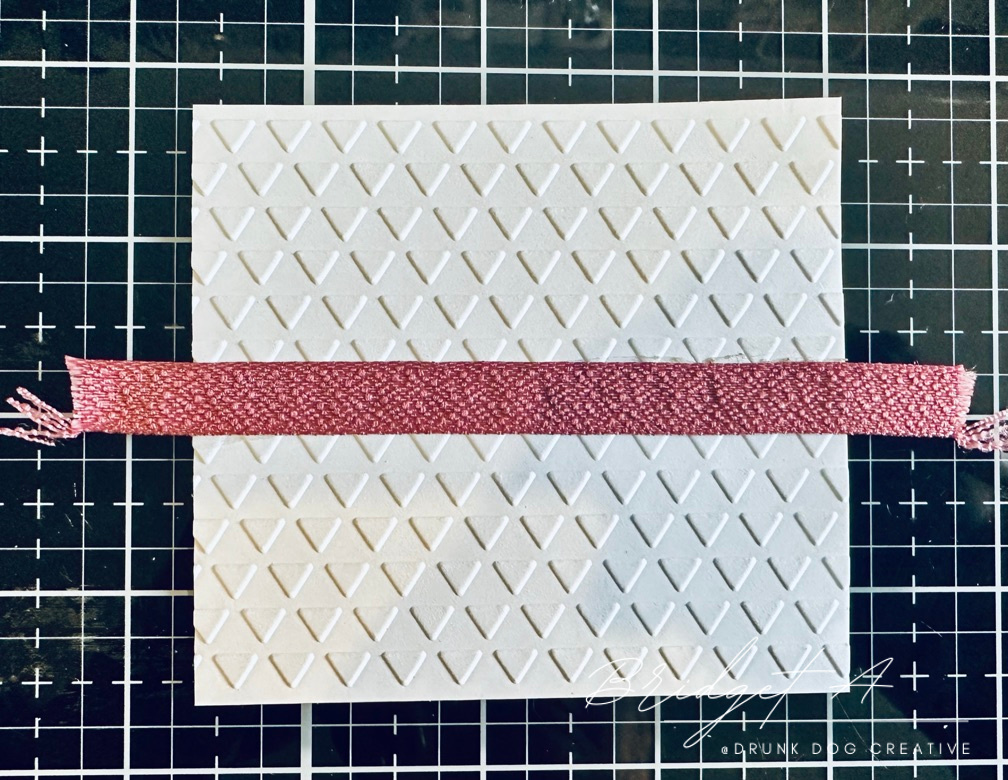 Affix the ribbon to the front of the Right Front Piece. I do this by putting a line of glue tape across. the cardstock and laying the ribbon over it. Then I put some glue tape on the back and fold the ends of the ribbon around and secure them to the back (see the tutorial video for a demonstration).