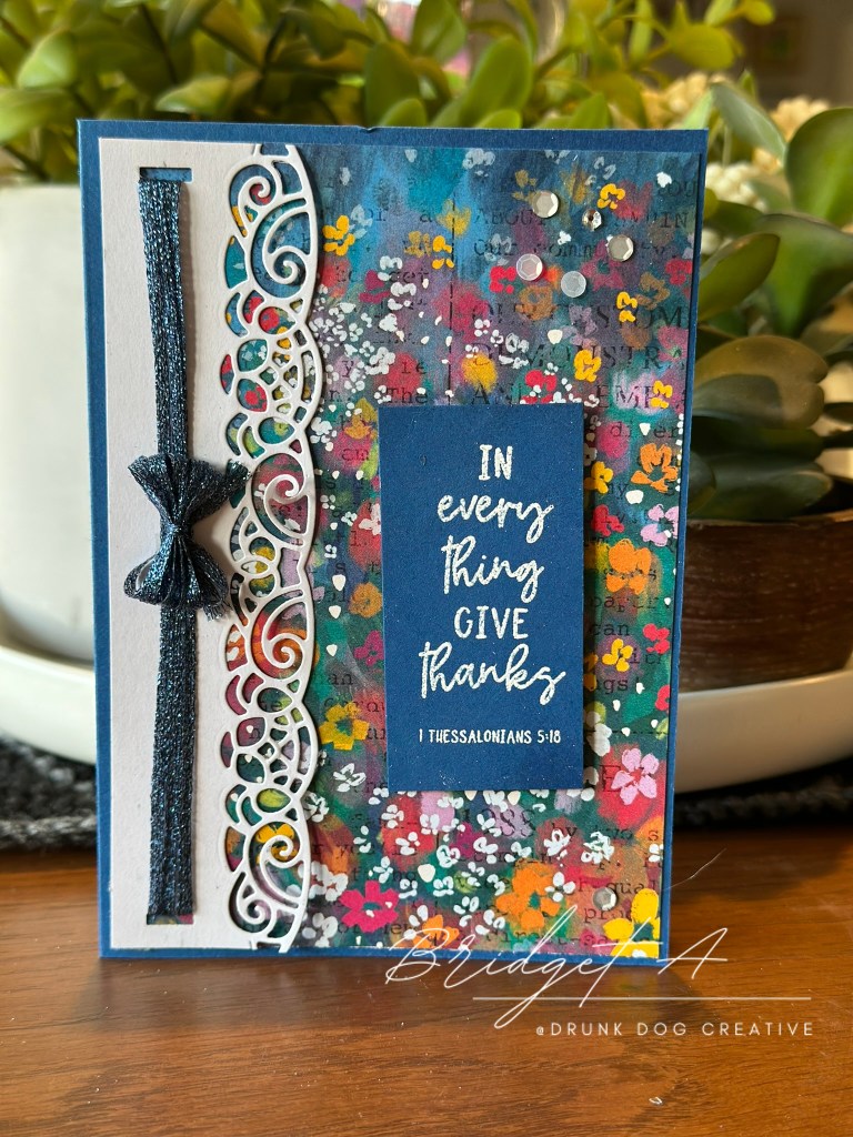 The middle card is made with Night of Navy ink, cardstock and ribbon. The one on the right has a sentiment from the Courage & Faith Stamp Set which is embossed in white on a simple rectangle cut from the Blueberry Bushel cardstock. All feature edge-cuts on the Basic White Thick cardstock from the Elegant Borders Die Set.