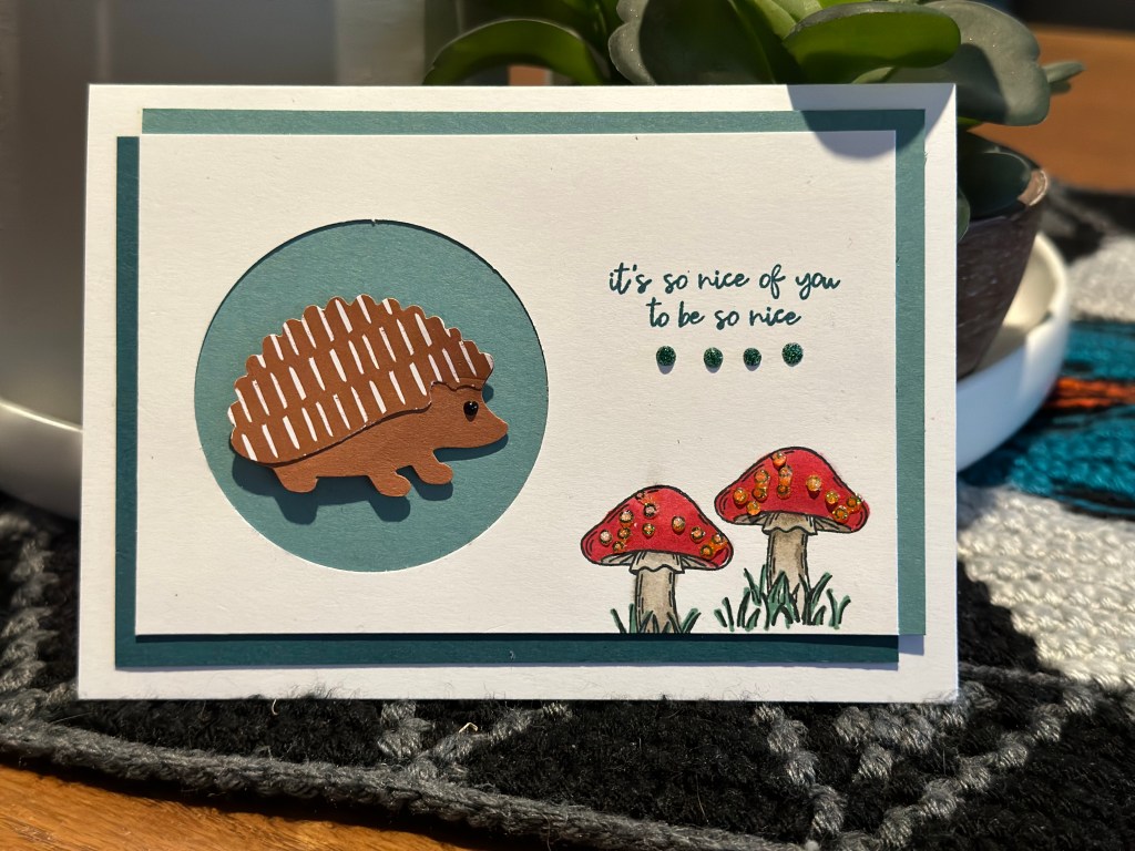 This is a standard 4-layer card layout but I’ve used the Stylish Shapes Dies to cut out two circles… I used the larger Stylish Shapes Circle to cut a stitched circle out of the cardfront and a smaller Stylish Shapes circle die to cut a circle from scrap Basic White Thick cardstock. On the smaller circle, I stamped the hedgehog with Early Espresso and coloured it in with Stampin’ Blends in Ivory and Dark and LIght Pecan Pie.