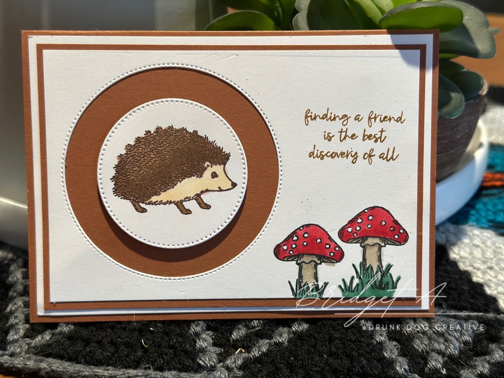 For these cards, I added a punched out circle using the 2-3/8” punch from Stampin’ Up! and made the hedgehog from Copper Clay cardstock and Copper Clay Designer Series Paper (DSP). While the punch will punch out eyes, I decided to make the eye using a Nuvo Drops in black.
