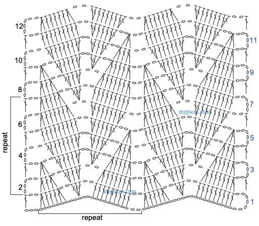 The Branching Leaves stitch chart is from mypicot.com. The chart is not of the pattern in this document but is intended to help you visualize how to do the rows. It includes only 2 repeats across of the pattern and does not include the edging sts in the pattern. Please follow the written pattern while using this chart to supplement your understanding of the stitch placement.