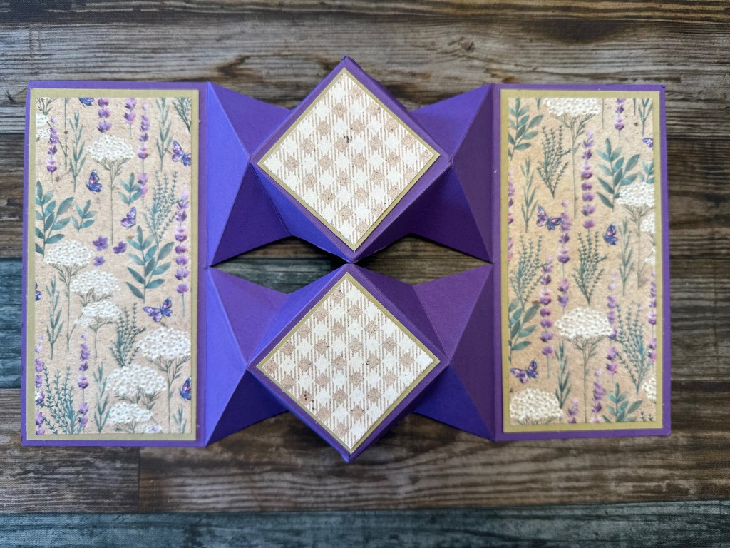The basic structure of the card allows you to do so much to it to make it uniquely yours. You can leave the pop-up mechanism unmatted, use only one layer of mats, or double mat it like in some of the photos here. You can leave the front diamonds plain – use white or vanilla cardstock with images stamped or drawn on them – or build them up into 3-D elements. You can put sentiments on the sides or even across the middle, tying the pop-up diamonds together. You can use any papers/combination of papers you want and any embellishments you want. You are only limited by your imagination!