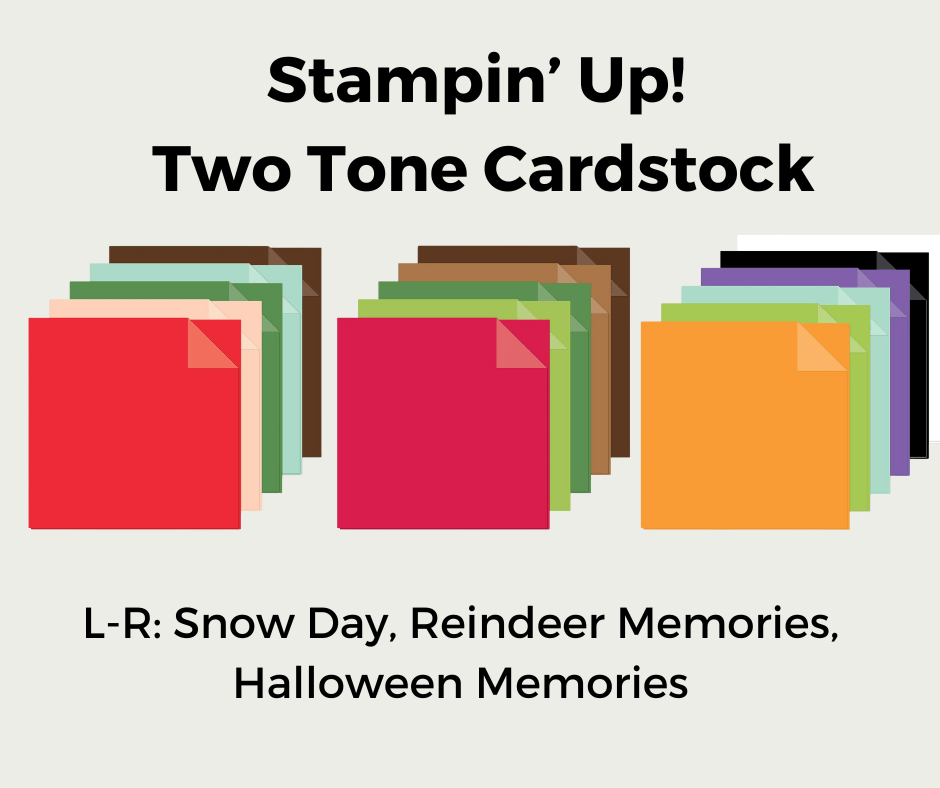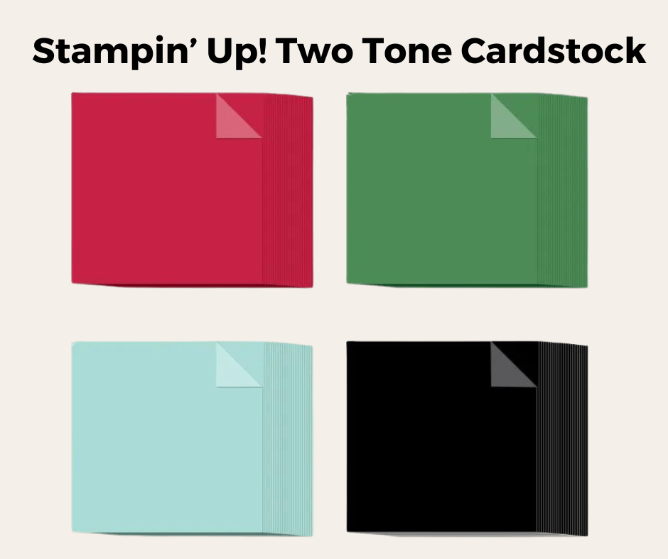 I think one of the most exciting things in the new offerings is the new two-tone paper. Right now this is available in holiday themed colour packs or in limited single colour packs. BUT… Stampin’ Up! will be rolling this concept out across ALL of its colours eventually. This paper has a white core with a darker shade of the colour on one side and the lighter shade on the other side. This is like our Stampin’ Blends alcohol markers where you get a dark and light shade of each colour. The white core allows for some really cool techniques like sanding embossed images (check out SU’s video on this technique HERE.