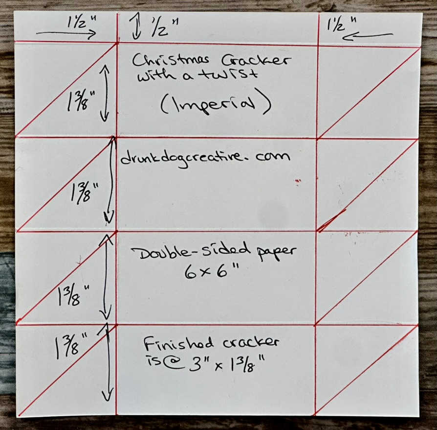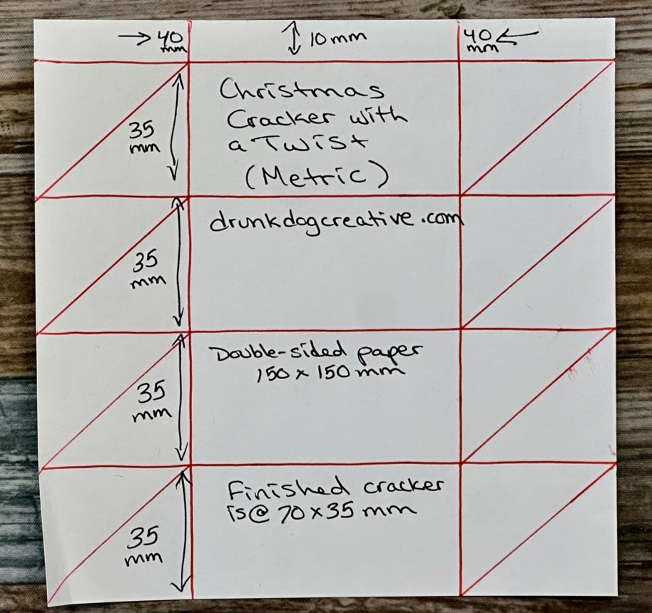 These twisted Christmas Crackers are all the rage in the papercraft world right now! I decided to make an Advent Calendar (Christmas Countdown Calendar) for my grandchildren with them. However, all the instructions I could find made crackers larger than I needed and seemed to waste a lot of paper – they were sizes which had to be cut from 30x30cm (12×12″) paper but with a lot leftover. So I decided to figure out how to make them from 15 x 15cm (6×6″) paper. This still gave me the perfect size to include three pieces of Aussie chocolate (one for each grandkid) and still fit inside a single shoebox (for mailing to the USA) and use my patterned paper more economically!