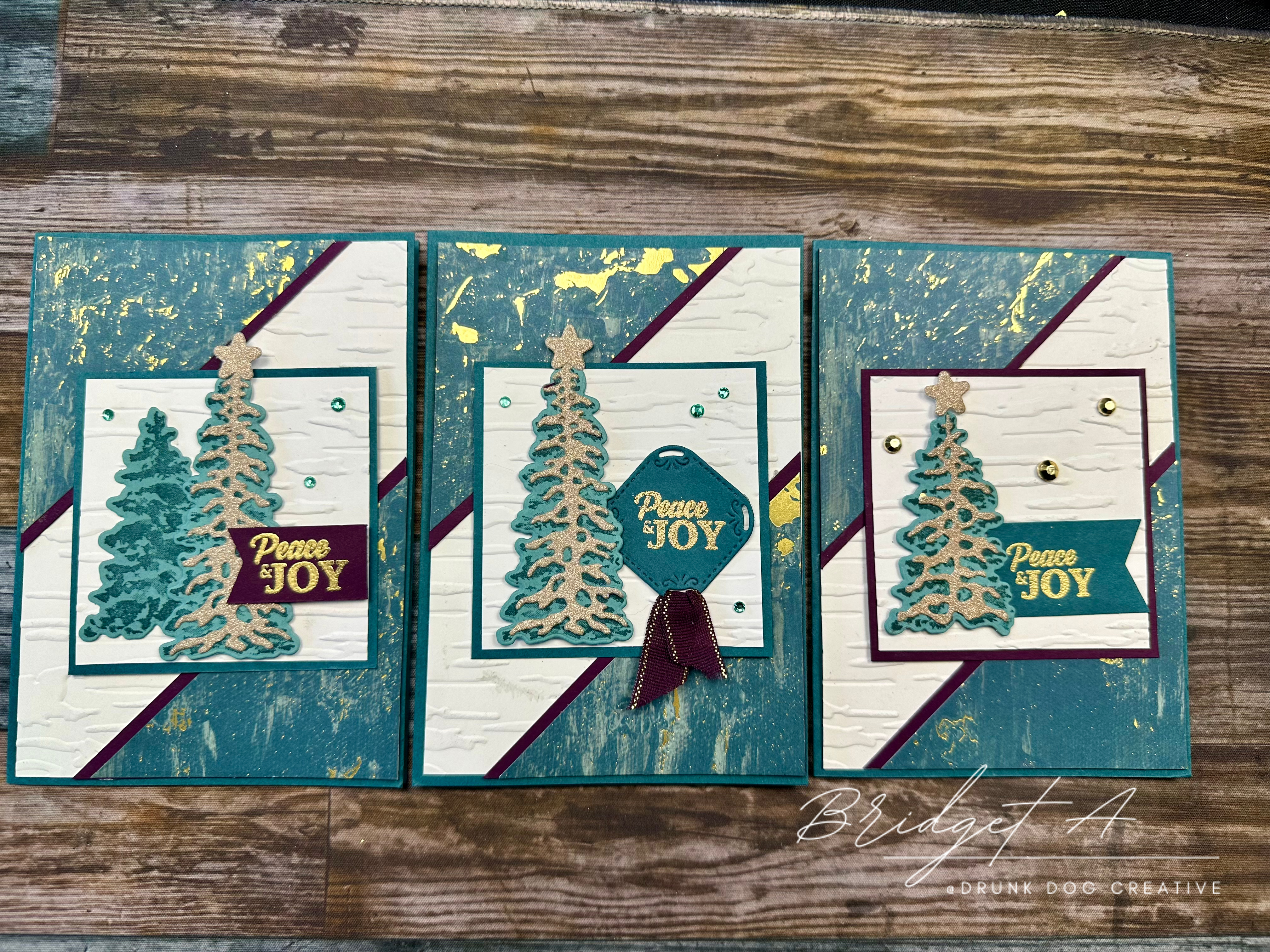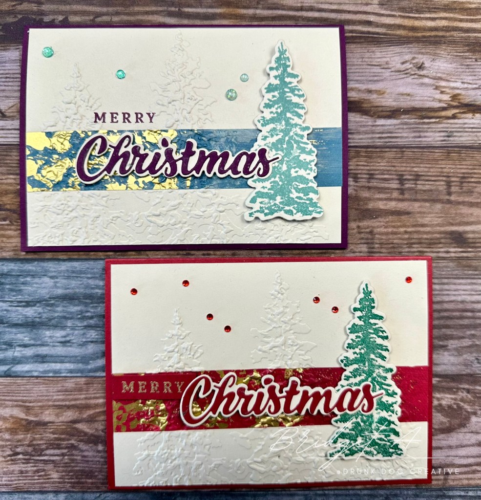 - Using Versamark Ink and Gold metallic embossing powder, stamp a sentiment to a scrap of paper and affix to the right of the middle tree, overlapping the tree and aligned with edge of the Feature Front.