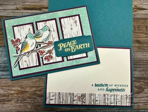 This year I decided to do a non-traditional colour scheme using Blackberry Bliss, Pretty Peacock, and Lost Lagoon with either Basic White or Basic Beige. I just love how these colour work together and how well they work with the DSP from Nests of Winter. That said, you can also use the more traditional Christmas Colours with this design and still produce a gorgeous card. I would recommend the following alternate colour groups: