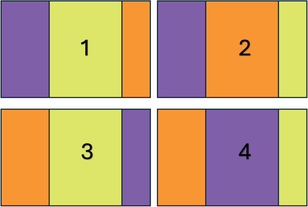 If you want to follow the 3 or 4 colour cardstock plan, the below information tells you where to place those colours so that each side has 3 different colours showing without doubling up.