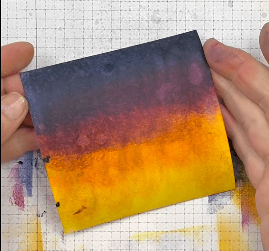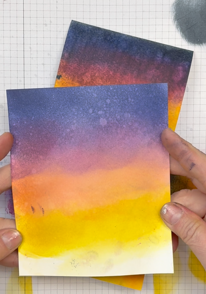 - Spritz the top area (the darker colours) with water again and let it dry (or use your heat tool to dry it). The last spritz should allow the water droplets to dry slightly differently and create a very subtle ‘starry’ effect in the sky.