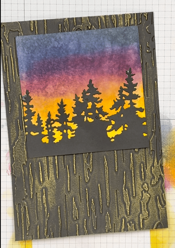 The background can be used with any die cuts or stamps in the foreground and with any colour/pattern of card base and mats you want. I find black silhouette type die cuts are the most striking against the sunset background, but honestly, almost anything can work with this background. Experiment with your own stash and your own colour combinations!