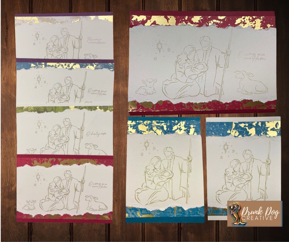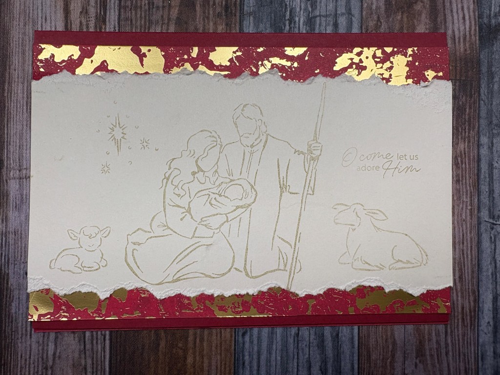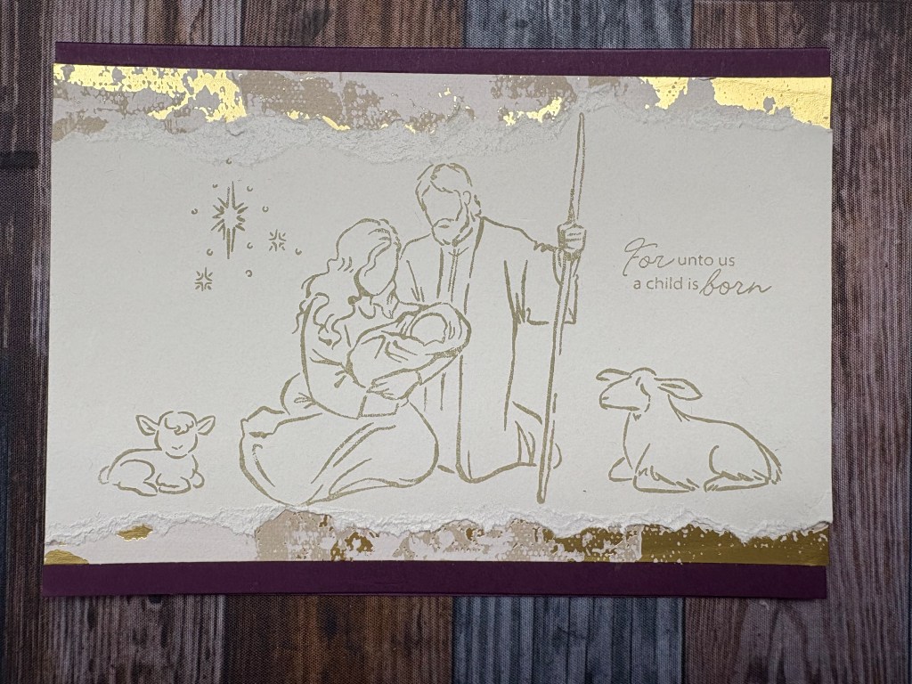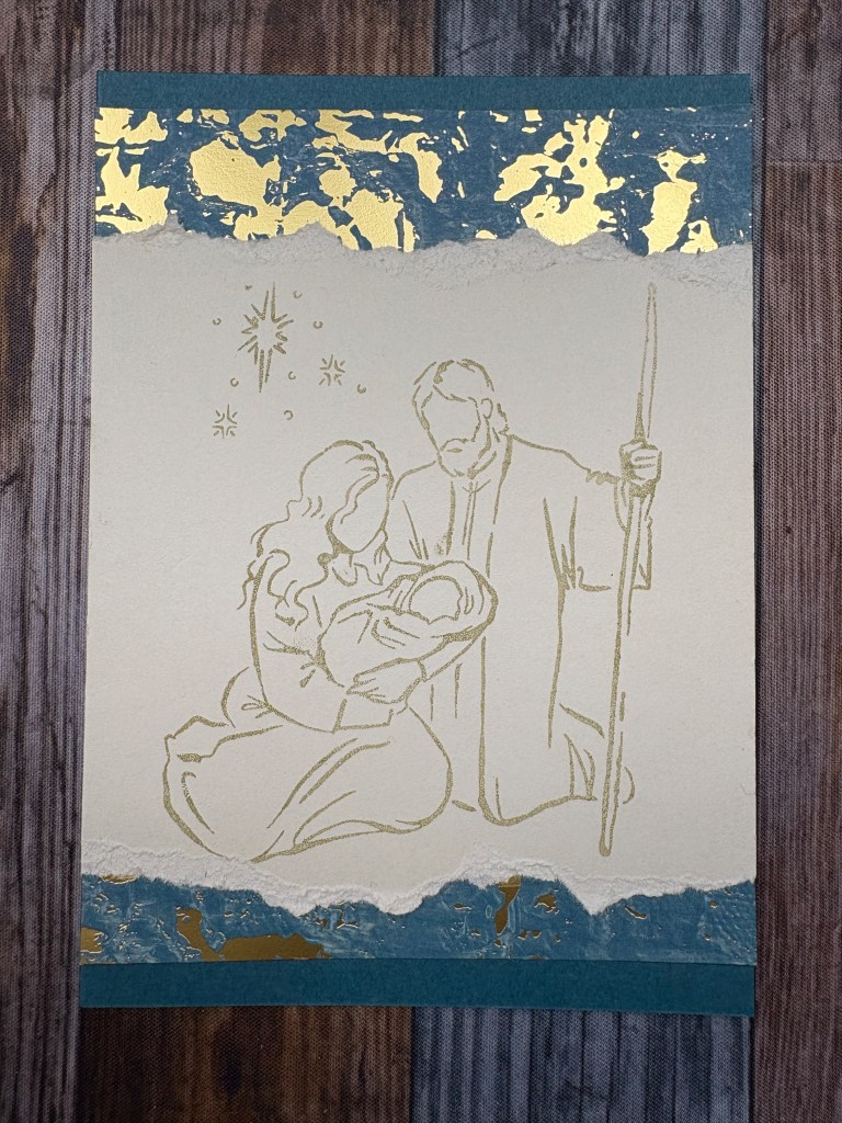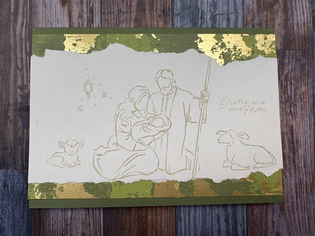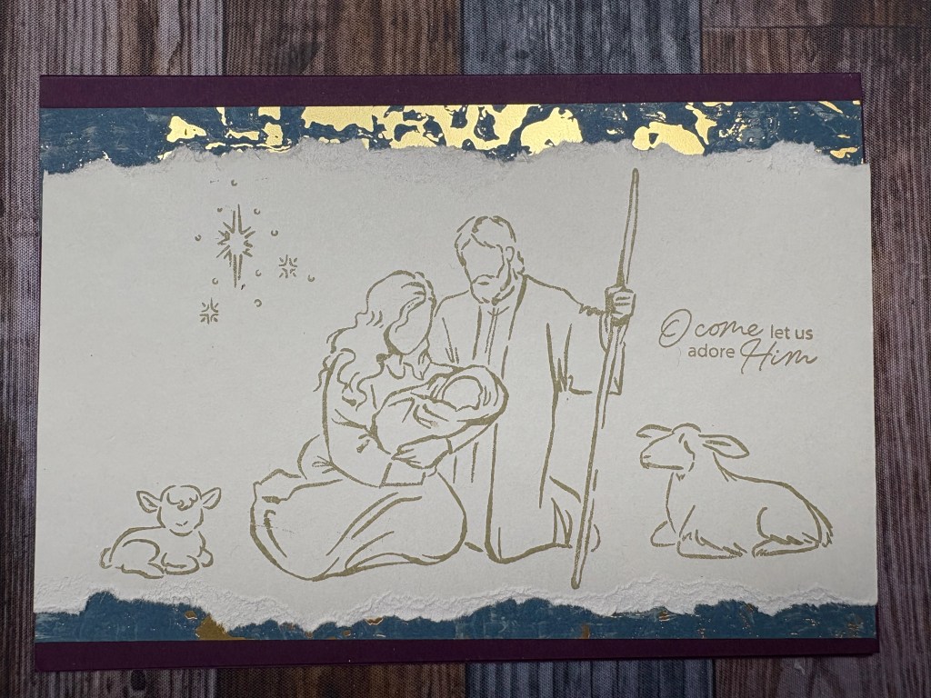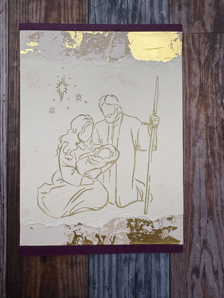 This technique is especially effective when paired with metallic accents and soft stamped imagery, making it perfect for Christmas and nativity-themed cardmaking.